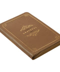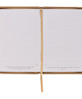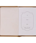 A beautiful gold-foiled frame runs along the topstitched edges of the smooth butterscotch cover and features elegant floral corner motifs. It surrounds the sentiment that is presented in heat-debossed letters accented with gold foil. Gold-foiled floral swags sandwich the sentiment at the top and bottom.