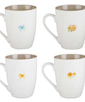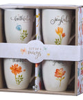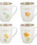 Express your gratitude this Thanksgiving season or all year long with the Grateful Ceramic Mug Set that includes 4 pieces - a mug to hold your coffee or tea at breakfast, lunch, dinner, and late-night snack time. The Grateful Ceramic Mug Set includes four creamy-colored ceramic mugs in a beautifully designed floral gift box with a see-through lid. Each mug features an encouraging phrase from Scripture, a larger floral design on the front, and a smaller floral accent on the back. The mugs are white on the outside and a light taupe on the inside. Gold foil is used for the lettering. The sentiment on each mug reads: