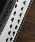 The charcoal gray front and back panels of this large giant Bible are inlaid with a solid black faux leather block. An elaborately detailed frame with a continuous fleur-de-lis motif surrounds the inlaid panel that also houses the silver-foiled version reference and title that are presented in an antiquated font.