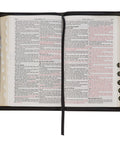 You will find several additions to aid your Bible reading in this Bible: a one-year reading plan, the words of Christ in red ink, reader-friendly subheadings, 8 full-color maps, and a thematic Scripture verse finder. The standard 9-point text is printed in a double-column format. The satin ribbon marker lets you mark your place between the gilt-edged pages, and the lay-flat spine allows the Bible to open completely flat. Two luxury features include thumb indexing to locate any book of the Bible and a zippered closure to secure your loose notes and bookmarks. The Bible comes packaged in a full-color printed cardboard sleeve.