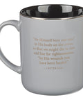 The front of the smooth gray ceramic mug features a brass-colored hammered zinc cross. The rugged artistry of the hammered cross, juxtaposed with the sleek ceramic of the mug, creates a timeless and striking design. A Scripture verse is gold-foiled on the back of the mug.