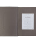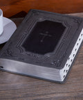 The lightly textured front and back gray faux leather covers of the Bible are inlaid with a black appliquéd panel. Elaborate concentric frames with detailed corner designs border the edges of the Bible and narrow in to hug the inlaid panel. On the front cover, a heat-debossed cross is centered on the black appliquéd panel. The spine is detailed with heat-debossed faux spine ribs accented with silver foil, as are the silver-foiled title and KJV version reference.