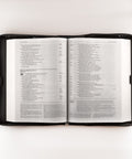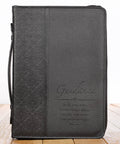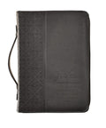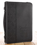 The spine of the black faux leather Bible cover is covered in a heat-debossed quatrefoil design, while the front panel is heat-debossed in a textured leather grain design. The sentiment and text are subtly heat-debossed on the front cover.