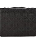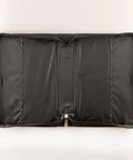 There is an exterior silver metal zipper with a cross-engraved zipper pull to close the cover securely, an exterior slip pocket on the back panel, a convenient lay-flat spine handle, and 2 pen loops inside.