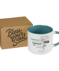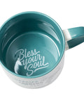 This ceramic mug has a white exterior with a blue handle and features the sentiment centered on one side. A sketch of that infamous tornado is featured alongside the blue and brown block lettering. The blue interior has the classic Bless Your Soul imprint on the bottom for a fun surprise when you finish your cup! Make your tea or coffee even more flavorful when you use the Happier than a Tornado In A Trailer Park Ceramic Coffee Mug!