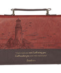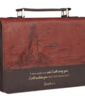 The I Have Made You Two-tone Brown Faux Leather Classic Bible Cover is part of the I Have Made You Lighthouse Collection, which also includes a magnetic bookmark set, a faux leather bookmark, a faux leather journal, a ceramic coffee mug, a wirebound journal, a reusable shopping bag, a faux leather Bible cover, a wirebound notebook, a weekly desk top planner and a gift bag.