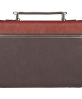 A lay flat espresso brown faux leather handle is attached to the spine with shiny gold metal candle hardware and folds away to allow the Bible inside to open flat. The covers are closed by a zipper with the same shiny gold metal zipper pull.