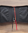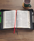 Inside the Bible cover are two pen loops to store writing instruments and two attached ribbon markers, a black one for the Old Testament and a red one for the New Testament.