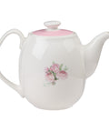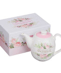 The white ceramic teapot is decorated with a pretty and classical design: bundles of pink watercolor roses blooming from behind a white rectangle with a gold foiled border that holds the sentiment.