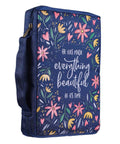 The navy and floral Bible cover is constructed from a durable, water-resistant, poly-canvas material that can endure heavy use. The full-color scattering of flowers and hearts is screen printed on the front of the cover. It surrounds the sentiment, taken from Ecclesiastes, that is screen printed in white.