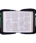 A spine handle, constructed from the same durable fabric, allows the Bible cover to open completely flat when in use. The sturdy navy zipper with an antique gold zipper pull keeps all contents securely inside. An exterior zip pocket, also with an antique zipper pull, is added to the back panel to store things like notes or church bulletins. Inside are two slip pockets that hold the Bible's outer covers, and two pen loops that allow for easy access to a pen and highlighter.