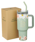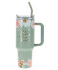A sage green background covers the entire exterior of this stainless steel tumbler. Pink and white flowers with yellow accents pop out from the top and bottom rims of the tumbler with large brushstrokes to give the impression that they are painted. The sentiment is printed in gold-foiled cursive script in the center of the tumbler.