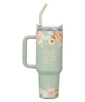 The He Restores My Soul 40 ox Stainless Steel Travel Tumbler is part of the He Restores My Soul Green Floral Garden Collection, which offers a variety of other gifts, such as a stainless steel tumbler, spiral journal, a vase, a candle, a spatula, a Bible cover, a set of prayer cards, a pillbox, a note block and pen combo, a small notebook, a compact KJV Bible and a die-cut magnet. This collection presents a message of hope and a scene of greenery so that you can give the gift of encouragement to a friend or sister.