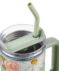 The sentiment repeats on the opposite side of the tumbler so that the design appears on either side of the oversized, green rectangular handle. The tumbler's clear lid is BPA and phthalate-free, giving it a tight seal. You can move the green dial attached to the lid to drink straight from the lid with a straw or close off the lid to save your drink for later. A reusable stainless steel straw with a green silicone tip is included with the tumbler.