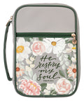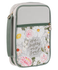The Bible's cover's front panel showcases a soft, gray background. It has a zippered exterior pocket, a cactus green zipper, and a rose-gold cross-engraved zipper pull. The pocket is printed with a peaceful pink and white floral design that surrounds the green scripted sentiment.
