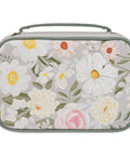 The same floral design is repeated on the back cover. The front and back covers are trimmed in cactus green piping. A coordinating cactus green lay-flat handle is securely attached to the spine. This gives the Bible case a sleek, modern look.