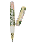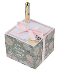 A hole punched through the top left corner of the note block provides a space to hold the pen that is included in this Christian gift set. The pen features the same floral design as the note block with white and pink florals set against a sage green background. It has a gold tip, clip, and ring and is filled with black ink.