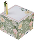 Each of the four sides of this note block is printed to create a cohesive floral design. The sage green background is adorned with yellow, white, and pink flowers, with light green and dark green leaves popping out between the petals in a brushstroke design. A blank space in the center of the floral design displays the sentiment in white cursive script.