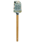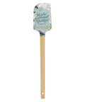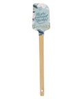 The spatula head showcases soft white and muted golden florals over a light blue background. The flowers surround the sentiment that is written in a beautiful navy script.