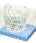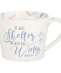 Feel wrapped up in the arms of the Lord and be reminded of His goodness while also letting the aroma of your favorite hot beverage engulf you as well. This mug, from our Psalm 91:4 feather collection is the perfect gift for mothers, reminding them to take a time out for themselves and praise God for his provision. On the outside of the mug sits a cheerful blue bird, perched on the verse, “He will shelter you with His wings,” Psalm 91:4. Inside the mug are a colorful array of feathers and branches.