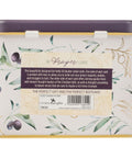 A metal tin is decorated with ripe purple olives on green-leaved branches and a laser engraved brass outlined shadow design. The purple lid is embellished with the sentiment adapted from 2 Corinthians 12:9.