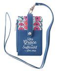 Take the comforting message of the His Grace is Sufficient Faux Leather ID Card Holder with you through your day. God's children can rest knowing that when they are weak, He is strong and his grace is all we need.The durable, scuff-resistant material of the His Grace is Sufficient Faux Leather ID Holder will hold up well during daily use. The navy blue body is accented with light blue credit card slots filled with pink florals. The front slot holds the silver foiled sentiment—adapted from 2 Corinthians 12:9.