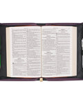 Gold metal handle hardware attaches a dark amethyst purple lay-flat carry handle to the spine of the Bible cover and matches the zipper pull, which is delicately engraved with the word Grace. Inside the case are two pen loops, so you can carry pens, pencils, or highlighters wherever your Bible goes and notate whenever necessary.