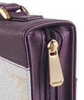 The rich dark amethyst purple back panel of the fashion Bible case wraps around the spine and meets a cream-colored front panel with a double row of topstitching. The screen-printed front panel is decorated with a watermarked leaf design and gold-foiled corner scrolls that frame the purple and gold-foiled lettering of the sentiment.
