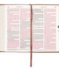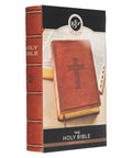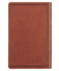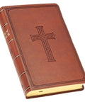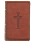 The honey-brown faux leather cover features a simple heat-debossed Celtic cross, adding grace to its design. On the spine, the Bible's title is elegantly displayed in gold-foiled letters, complemented by heat-debossed faux spine ribs adorned with gold-foiled bands.
