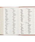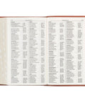 The Bible features an easy-to-read text, printed in a legible 14-point font and organized in a convenient double-column format. It has useful navigation tools, including an attached satin ribbon marker for bookmarking, thumb indexing for quick referencing, and a thematic Scripture verse finder. For those seeking even more features, the Bible provides valuable resources such as a concordance, the words of Christ highlighted in red ink, cross-referencing, and eight full-color maps.