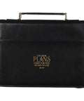The back panel features a convenient slip pocket, perfect for stashing loose notes. A sleek black zipper, complemented by a round gold metal zipper pull engraved with a cross, securely closes the covers. Matching gold metal handle hardware attaches a lay-flat spine handle. This design ensures the handle folds neatly out of the way, preventing damage to your Bible when you open the case.