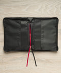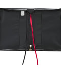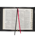 Discover the unique features of our Bible cover. Inside, you'll find two elastic pen loops for easy access to your pen and highlighter. But what truly sets this cover apart are the color-coded satin ribbon markers attached to the spine. They offer a clever and stylish way to navigate between the two testaments: red for the New Testament and black for the Old Testament.