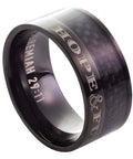 This exquisitely crafted men's ring reminds us of the declaration God makes, giving us hope and a future as referenced in Jeremiah 29:11. This men's ring features a black carbon diamond pattern inlay with a stamped metal design. Inside the band is stamped the Scripture reference, Jeremiah 29:11. The overall detailed design gives it a sleek sophisticated look.