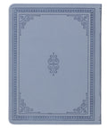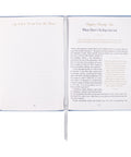 The devotional's blue faux leather cover features a heat-debossed double frame design with diamond accents and corner scrolls. The title is set in the middle of the frame and presented in an elegant, silver-foiled font.