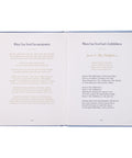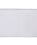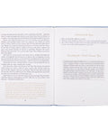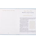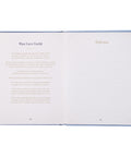 The devotional's blue faux leather cover is complemented by silver gilt edging along the page edges, enhancing its soft, feminine character. Inside, the pages are printed in a dual-color scheme: navy and gold ochre. A blue satin ribbon marker is included for convenience, so you can keep your place without folding the pages.