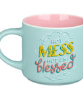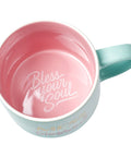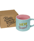 The Hot Mess But I’m Blessed Ceramic Mug is colored a calming light aqua with the primary design presented on one side. Decorative flourishes surround the sentiment written in white, yellow, and pink lettering. The light pink interior continues with the calming pastel color scheme! And at the bottom of the mug is a Bless Your Soul imprint for a cute surprise when you finish your drink.