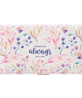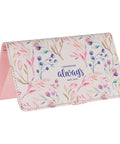 The daintily decorated Faux Leather Checkbook Cover is made of a supple, scuff-resistant white faux leather and adorned with watercolored flower buds, berries, and leaves in soft pastel colors. The pattern starts on the back cover and weaves itself around the spine and around the centered Bible verse written in blue foiled whorled azure calligraphy, with size and emphasis given to the central word of this passage: always.