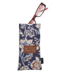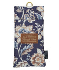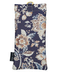Large brown and blue florals trim the navy blue background of the faux leather eyeglass case. A Honey-brown patch, gold-foiled with the sentiment, is appliquéd to the smaller front pocket.