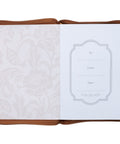 The trendy honey-brown faux leather cover is heat-debossed with a winding floral vine design that starts on the back, meandering its way onto the front cover, where it surrounds a vignette with the gold-foiled sentiment.