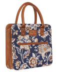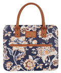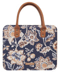 The front and back panels of the purse-style Bible case are screen-printed with large brown and blue flowers set against a navy blue background. The front panel features a slip pocket that is trimmed in honey-brown faux leather. The trim matches a small appliquéd patch that is heat-debossed with the sentiment.