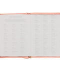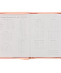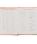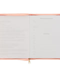 A matching coral zipper enclosure binds both covers with a gold zipper pull to accent. A satin ribbon marker is attached to the spine to mark your page, and the interior pages are printed in two colors.