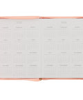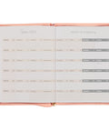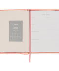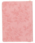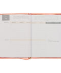 The covers of the 18-month planner are wrapped in light coral-pink faux leather that is decorated with large heat-debossed florals. A smooth coral frame on the front cover is outlined with a thin gold foiled border and forms the backdrop for the Scripture sentiment featured in alternating heat-debossed and gold-foiled lettering. The gold foil is repeated in the year that is placed below the frame.