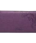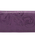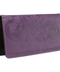 The front of the smooth purple faux leather checkbook wallet is heat-debossed with a swirly floral design that wraps around the spine and runs down the back panel. The sentiment is subtly heat-debossed at the bottom of the front panel.