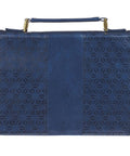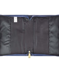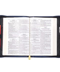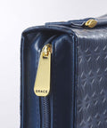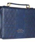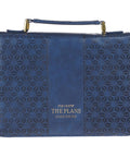 This is a lovely Bible case that is both beautiful and practical! Luxurious dark blue faux leather is heat-debossed with a geometric pattern. A solid stripe that runs vertically down the middle features a portion of the Scripture verse printed in classic gold-foiled lettering with the verse reference heat-debossed beneath.