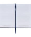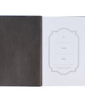 The blue faux leather cover of the classic journal is heat-debossed with an ornate floral trellis design that starts on the back cover and makes its way around the spine to where it spills over onto the front cover. Here the trellis design is kept at bay by the shiny gold-foiled sentiment that is presented in a vertical column in a multi-font design.