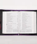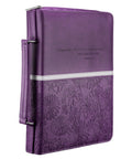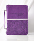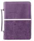 The cover is separated by two panels—a smooth purple panel on the top and a purple heat-debossed floral panel on the bottom. A topstitched white band separates the two panels. The smooth panel, embossed floral motif panel and contrasting white band are carried front to back. Scripture is heat-debossed on the top panel.