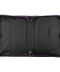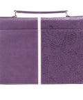 The purple Bible cover is constructed of durable, supple soft faux leather that reminds of glove leather. There is an exterior slip pocket on the back, a cross engraved zipper-pull, a convenient suitcase-style handle with silver hardware and 2 interior pen loops.