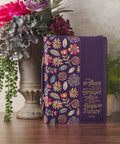 The I Know the Plans Purple Floral Faux Leather Fashion Bible Cover conveys the hopeful message that our well-being is ultimately in the hands of our Creator while also providing stylish protection for your Bible. Colorful stylized flowers blanket the back, spine, and just over half of the front panel of this deep purple faux leather Bible cover. A smooth purple panel meets the fun floral design on the right edge of the front cover. On this soft panel, the sentiment is gold foiled in an artistic topographical arrangement.