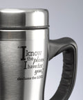 With its encouraging message, the I Know The Plans Stainless Steel Travel Mug with Handle makes an inspirational Father's Day or birthday gift for your husband or father.