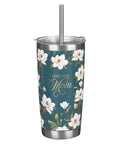 The I Love You, Mom Blush Magnolia Stainless Steel Travel Tumbler with Reusable Straw is part of the Strength and Dignity Blush Magnolia Collection, which includes a ceramic coffee mug, a faux leather journal, a stainless steel travel tumbler with a reusable straw, a gift bag, a magnetic notepad and pen, and a wirebound journal.